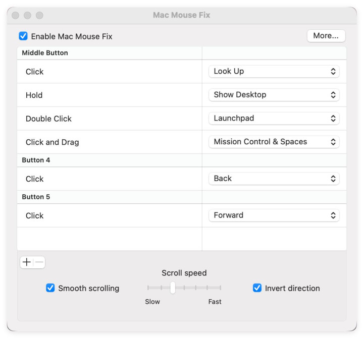 比如Mac Mouse Fix,可以根据鼠标的按键来增加一些功能,普通鼠标点击、双机、点击加拖拽等能力。