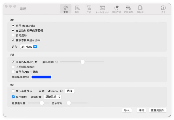 MacStroke这个软件也很强大,它可以让Mac 上软件实现类似浏览器上手势动作,还能增加右键菜单等,算是比较实用的鼠标增强软件。