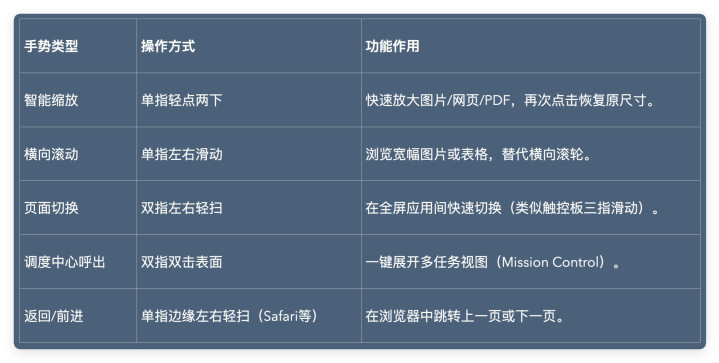 先来认识一下妙控鼠标基本操作,从我个人角度来理解,妙控鼠标是把触控板一些操作鼠标化。